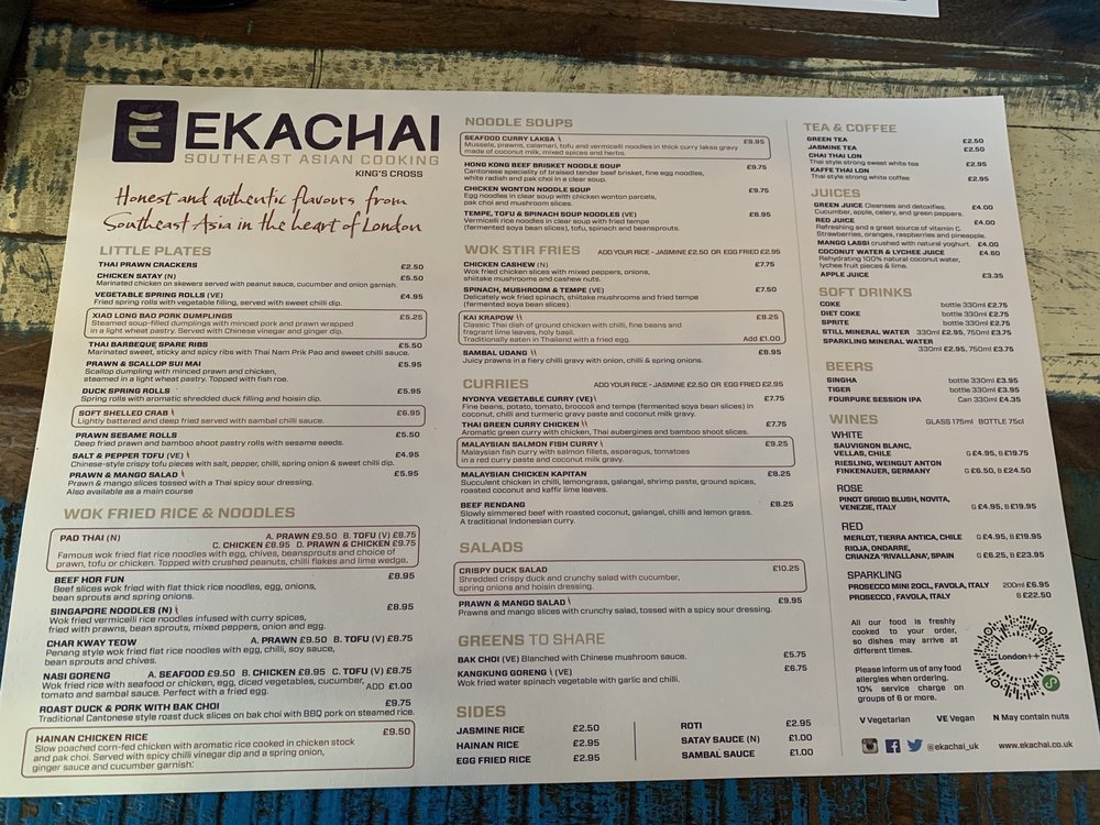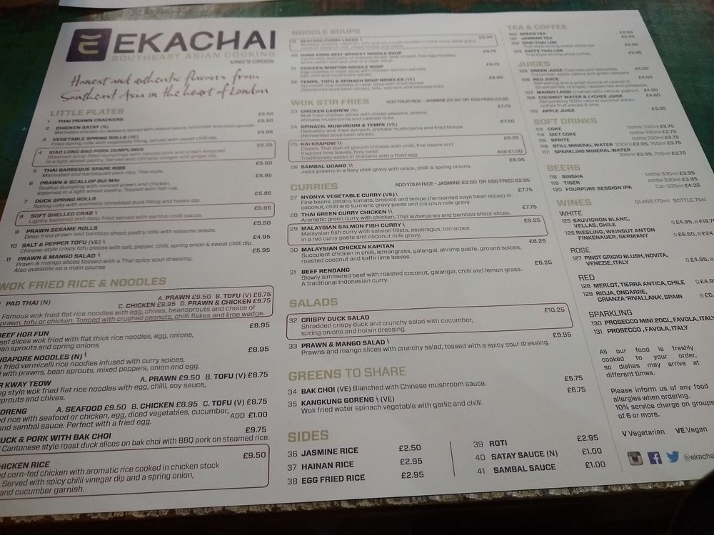 Welcome to Ekachai, located at 66 York Way, London, where Thai culinary artistry comes alive! This vibrant eatery offers an extensive menu that tantalizes the taste buds with traditional flavors. Highlights include the famous Pad Thai, featuring wok-fried flat rice noodles complemented by prawns, tofu, or chicken, finished with crushed peanuts and a lime wedge. For noodle aficionados, the Beef Hor Fun delivers thick, luscious rice noodles stir-fried with tender beef and fresh vegetables.
